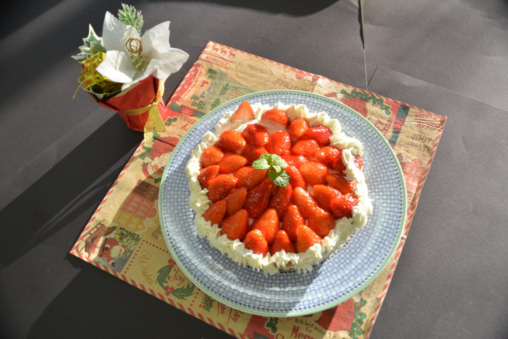 そして12月には、2年生最後の活動となるクリスマス会を行ないました。メニューやレシピなどを部員でじっくり話し合い、ピザ、ミネストローネ、いちごのタルトの3品を作りました。写真のようなとてもおいしいものができ、とても楽しいクリスマス会となりました。