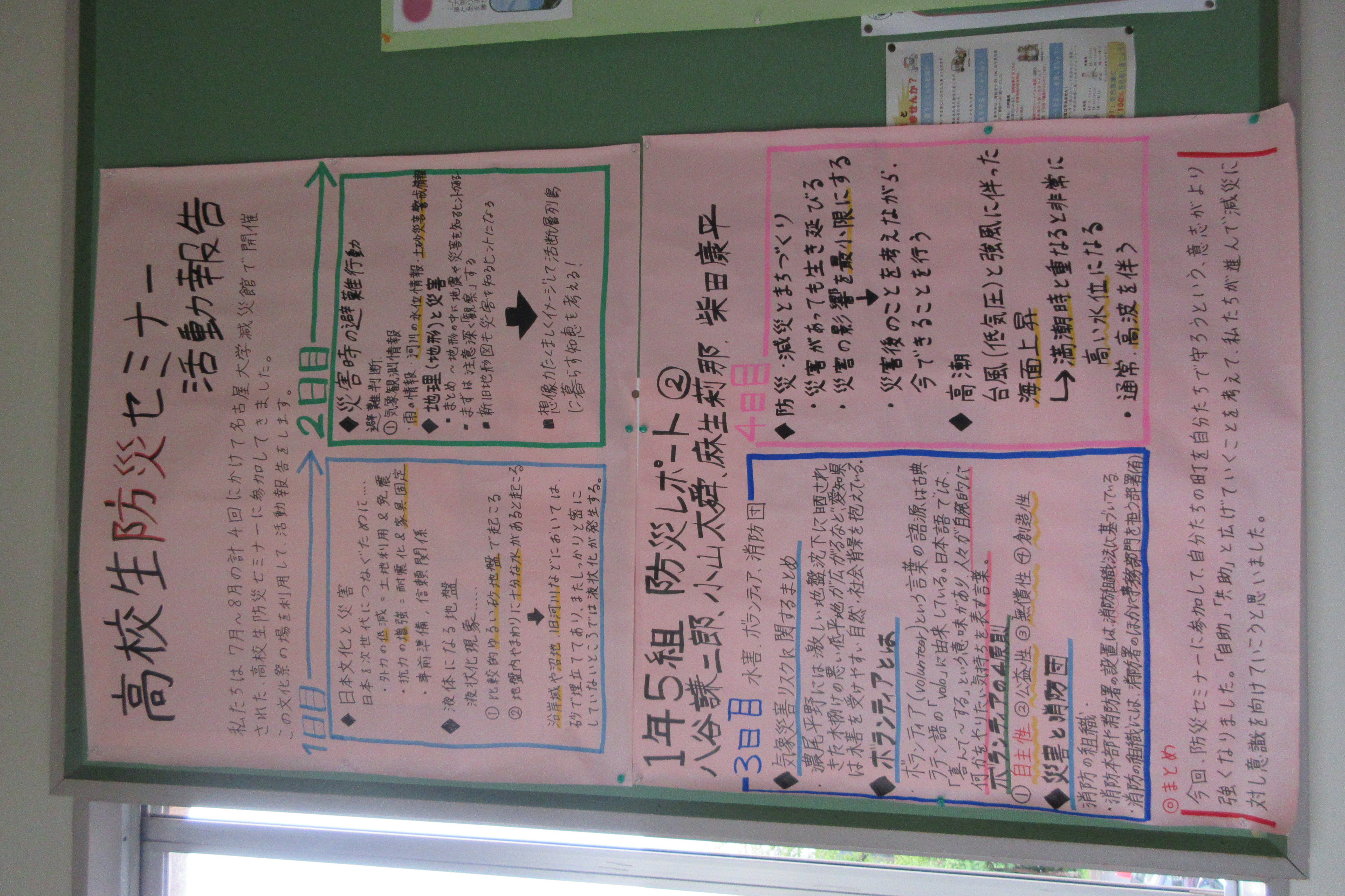 高校生防災セミナー校内活動 2019年1月11日/カテゴリ: 行事レポート /作成者: 江南高校名古屋大学、愛知県防災局、愛知県教育委員会が主催する高大連携高校生防災教育推進事業「高校生防災セミナー」に本校から代表生徒4名が参加しました。セミナーで学んだことを生かして、学校の防災教育活動に主体となって参加しました。それら活動の一部を紹介します。 ①防災訓練(平成30年9月3日実施) 全県的な取り組みである「あいちシェイクアウト訓練」に全校で参加し、放送で実施しました。内容は防災セミナー参加生徒による防災講話、防災クイズ、およびシェイクアウト訓練指導です。 ②文化祭で取り組みの発表 防災セミナーで学んだ事を全校生徒に掲示物で報告しました。 https://ko-nan.ed.jp/wp-content/uploads/2019/01/防災に関する掲示物.jpg 3456 5184 江南高校 http://ko-nan.ed.jp/wp-content/uploads/2018/01/logo.png 江南高校2019-01-11 13:37:512019-01-11 13:37:51高校生防災セミナー校内活動
