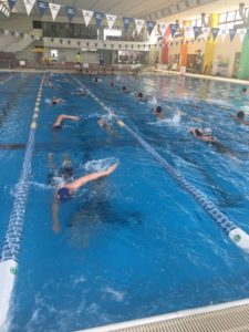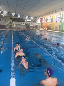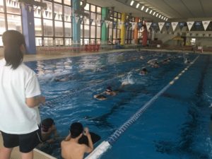 今年度は1年生男子8名、女子6名が入部し、男子20名、女子14名で活動をすることとなりました。大勢でとっても賑やかです。現在江南高校のプールは修理中で使うことが出来ませんが、大口町温水プールを利用して、4月から泳いでいます。例年と比べると泳ぐ回数は少し減ってしまっていますが、外のプールでは寒くて長時間泳ぐことが出来ない時期でも、温水プールでは関係ないので、しっかりと泳げています。また、長時間泳げているのは、冬のオフトレーニングの成果も出ているのかな?