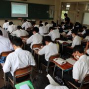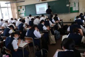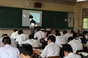 本日は、第3時限に1年生の「物理基礎」において研究授業が行われました。多くの職員が参観する中、生徒らは水平投射や斜方投射の軌道について学びました。難しい例題もありましたが、生徒らは真剣に取り組みました。