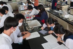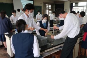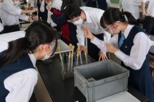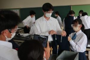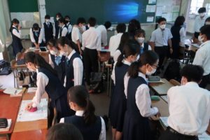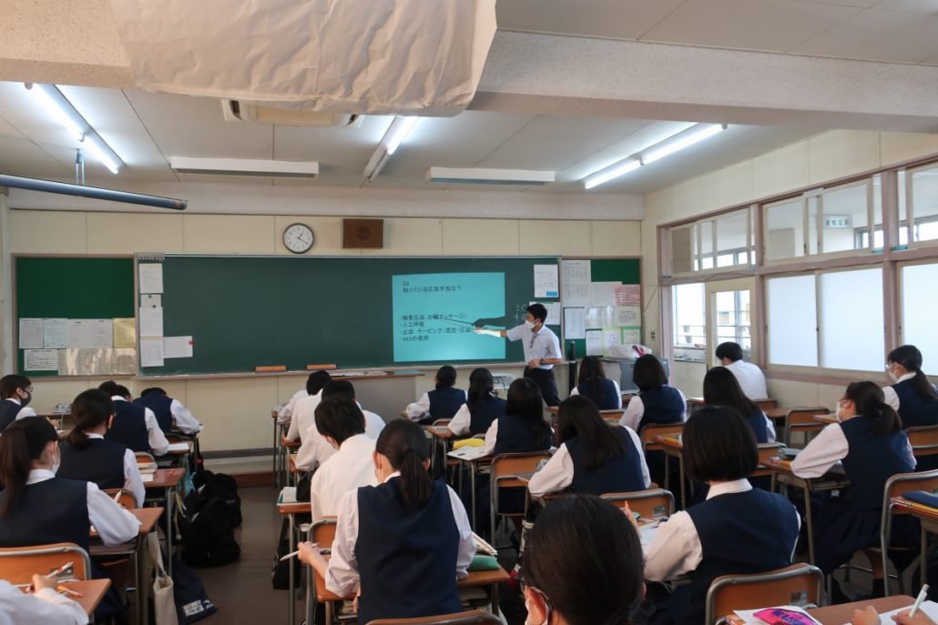 本日は、4限に2-8の「保健」で、5限に3-2の「化学」で研究授業が行われました。保健は応急手当の単元で、応急手当の意義について学んだ後、胸骨圧迫の実習を体験しました。化学は金属イオンの単元で、前時に自ら計画した手順に従って班ごとに実験を行い、ロイロノートに結果をまとめました。