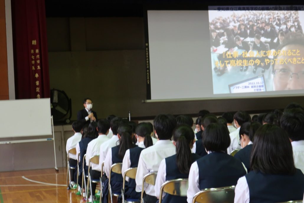 キャリア講演会(10月17日) 2022年10月17日/カテゴリ: 学校日記 /作成者: 江南高校本日、第5時限の「探Q」の時間には、1年生を対象にしてキャリア講演会が行われました。講師にブラザー工業(株)の小椋浩一様を迎え、社会人として求められる能力や高校生の今、必要なことなどについて御講話をいただきました。「迷ったら、怖れずチャレンジ!」「がんばる。成長し続ける。そうすれば必ず味方が現れる。」「チャンスはどこから来るか分からない。できることをたくさん準備しておく。」などのメッセージをいただきました。また、自分の10年後の姿を考えて、伝え合うペアワークには、生徒らは活発に取り組んでいました。御講話の最初と最後で、オブラ・ウィンフリーの言葉「幸運とは、準備が機会にめぐりあうこと」を紹介され、”準備”が大切であることを強調されました。1年生の皆さん、本日のお話をしっかりと受け止めて、将来の目標達成につなげていきましょう。小椋様、ありがとうございました。 https://ko-nan.ed.jp/wp-content/uploads/2022/10/s_IMG_4823-e1665998391770.jpg 200 300 江南高校 http://ko-nan.ed.jp/wp-content/uploads/2018/01/logo.png 江南高校2022-10-17 18:37:072022-10-17 18:37:07キャリア講演会(10月17日)