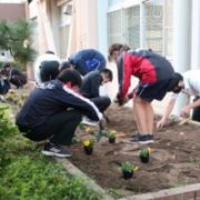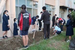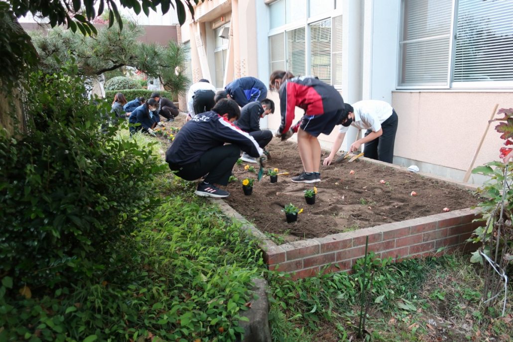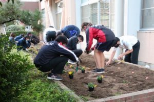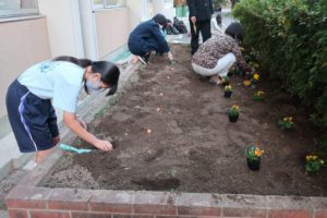 昨日・本日と、1・2年生美化委員と保健指導課等の職員によって、花苗と球根の植え付けを行いました。水やりを終えた花壇には、パンジー、ビオラが咲いています。来春には、チューリップも花を咲かせてくれることでしょう。生徒の皆さん、先生方ありがとうございました。