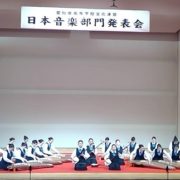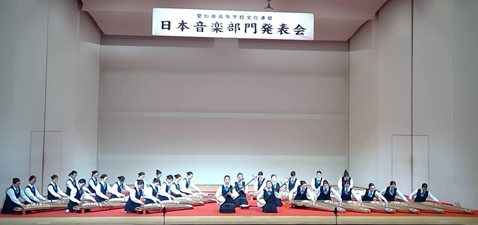こんにちは!箏曲部です。私たちは1年生12名、2年生17名の計29名で、主に1月に行われる県大会に向けて活動しています。昨年まではコロナの影響で外で演奏できる機会がありませんでしたが、今年は技術指導の先生方のご紹介で、夏に岐阜での演奏会に参加させていただきました。2年生のみの出演でしたが、昨年今の3年生と大会で演奏した杵屋(きねや)正邦(せいほう)の「鹿島(かしま)立(だち)」を最高の出来で会場の皆さんにお届けできたと思います。