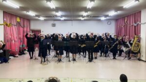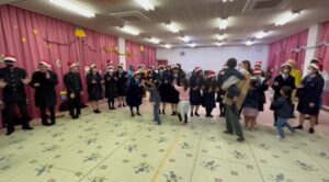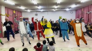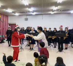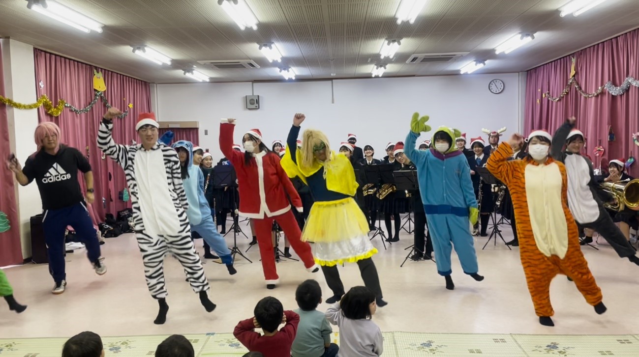 江南市立中央保育園訪問(クリスマス会) 2023年12月22日/カテゴリ: 行事レポート /作成者: 江南高校今年度も12月20日(水)に江南市立中央保育園を訪問させていただきました。 最初に生徒会が「ジャンボリミッキー」のダンスを披露し、その後、吹奏楽部が「さんぽ(となりのトトロ)」、「アイドル」、「Y.M.C.A」を演奏しました。「Y.M.C.A」では、吹奏楽部のリードでみんながジェスチャーをして大いに盛り上がりました。最後に保育園のみなさんにフォークダンスを教えていただき、ハイタッチをして交流を深めることができました。 中央保育園のみなさん、ありがとうございました。 https://ko-nan.ed.jp/wp-content/uploads/2023/12/①ジャンボリミッキー.jpg 727 1299 江南高校 http://ko-nan.ed.jp/wp-content/uploads/2018/01/logo.png 江南高校2023-12-22 15:08:552023-12-22 15:08:55江南市立中央保育園訪問(クリスマス会)