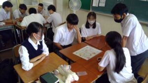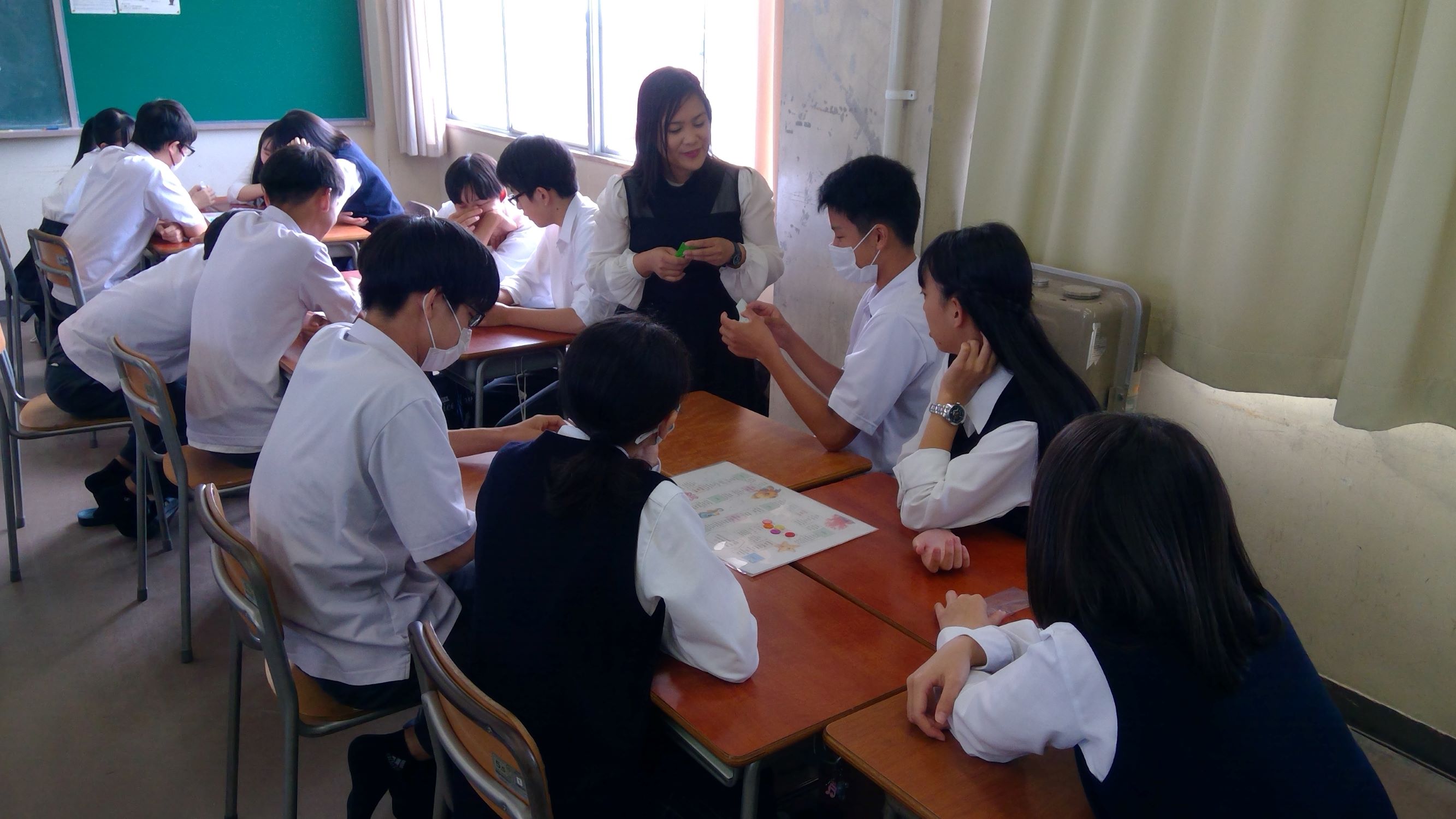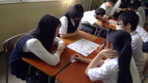 ゲーム自体は馴染みのある簡単なすごろくですが、止まったマスに書かれた英文を理解し、質問に答えなければ前へ進めません。グループのメンバーと協力しながら楽しむことができました。積極的に英語で話そうとする姿に成長を感じられました。