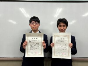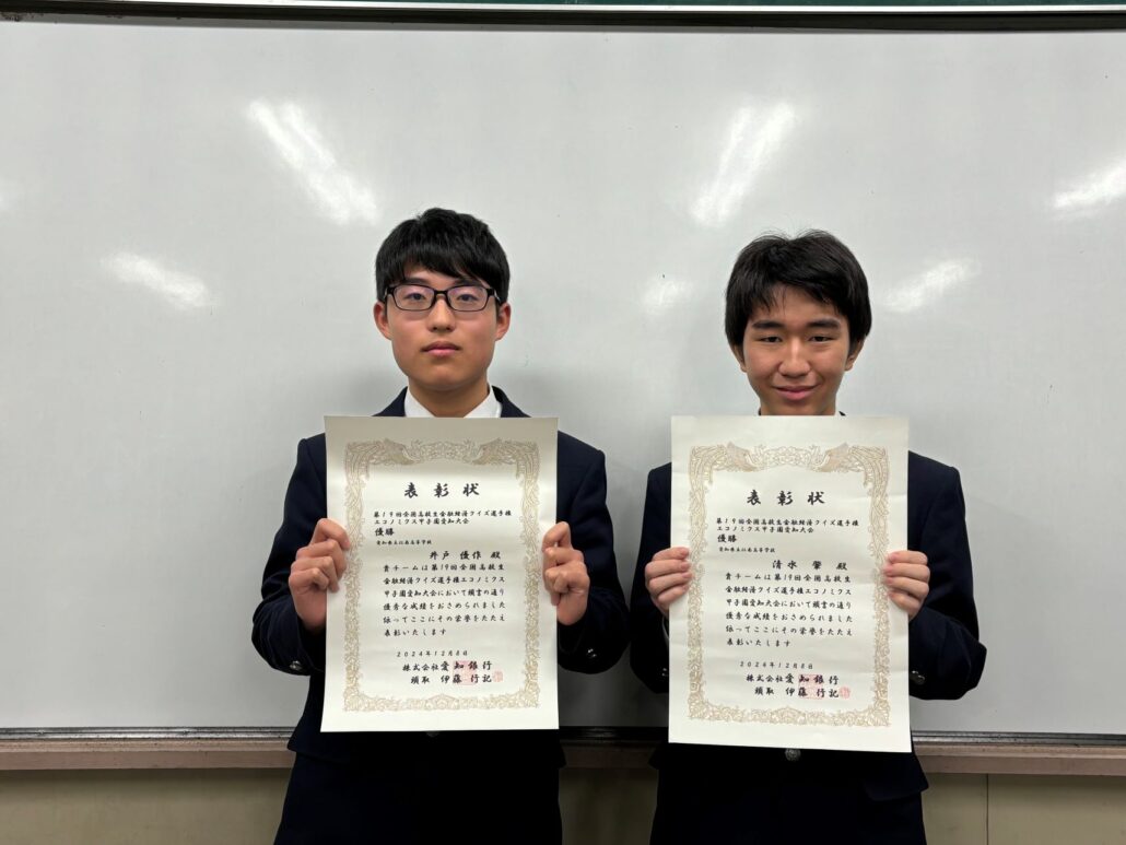 「第19回全国高校生金融経済クイズ選手権 エコノミクス甲子園」の全国大会に出場する二人の生徒の壮行会も行われ、生徒会長が三三七拍子の音頭をとって、全校生でエールを送りました。