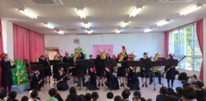 12月19日(金)に生徒会執行部5名と吹奏楽部約30名、教職員5名で江南市立中央保育園を訪れ、クリスマスコンサートを開催しました。