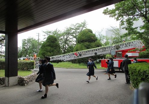 江南消防署の方々のご指導の下、まず「地震→火事発生」の想定でグラウンドに避難をしました。さらに1年生は「防災クイズ」、2年生は「はしご車降下訓練」、3年生は「消火器による消火訓練」を体験しました。