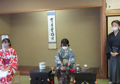 藤波祭・文化祭2日目に恒例の「お茶会」を開きました。感染防止の工夫も施しながら、今年は「立礼」というテーブルと椅子を利用してのお点前で楽しんでいただきました。部員が少ない中、それぞれがお点前、お運び、受付等協力して行うことができました。
